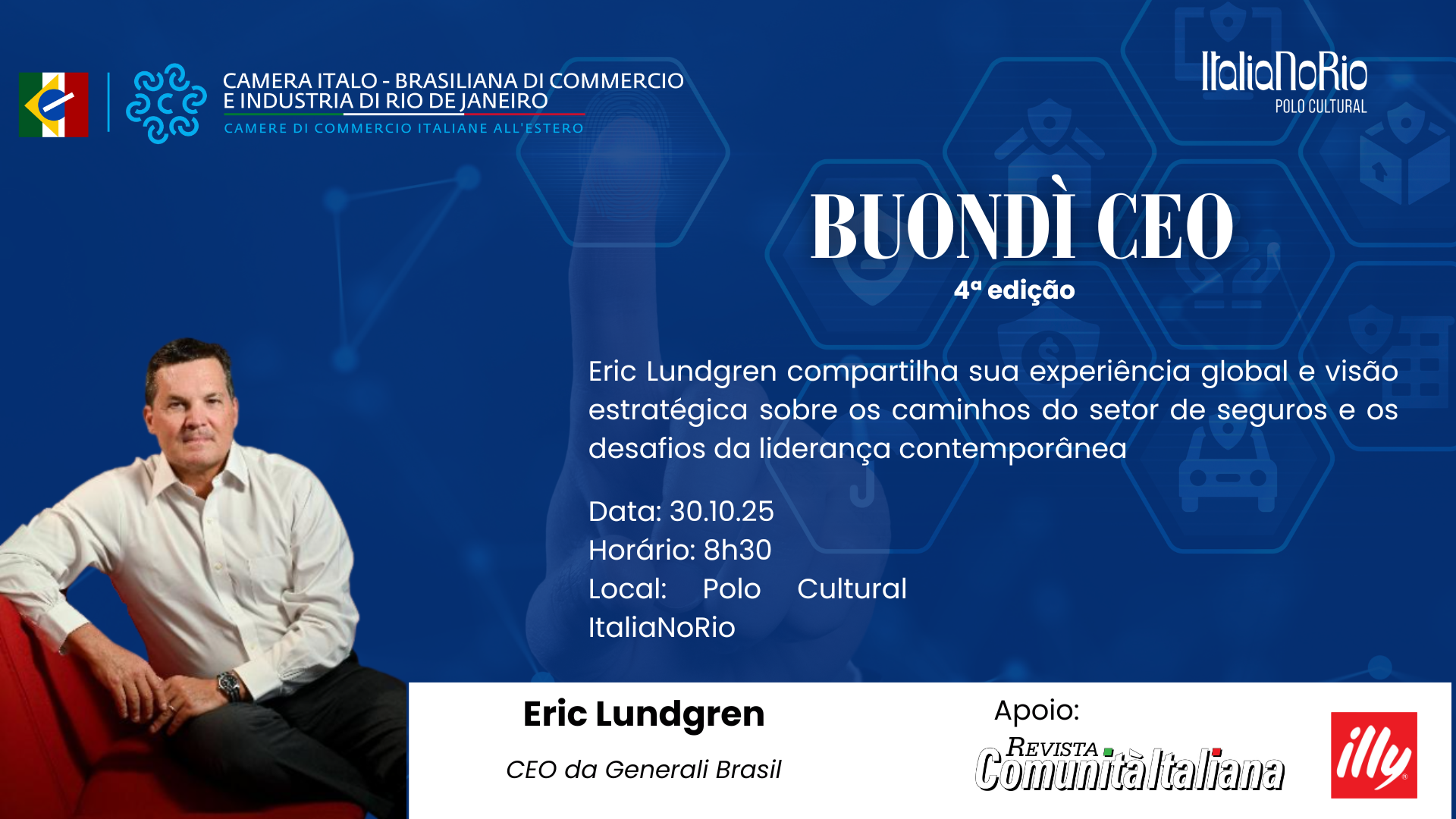 A Câmara Ítalo-Brasileira de Comércio e Indústria do Rio de Janeiro (CCIE-RJ), em parceria com o Polo Cultural ItalianoRio, realiza mais uma edição da série “Buondí CEO!”, que de julho a novembro reúne executivos de grandes empresas italianas atuantes no Brasil para discutir temas estratégicos sobre liderança, inovação e sustentabilidade.